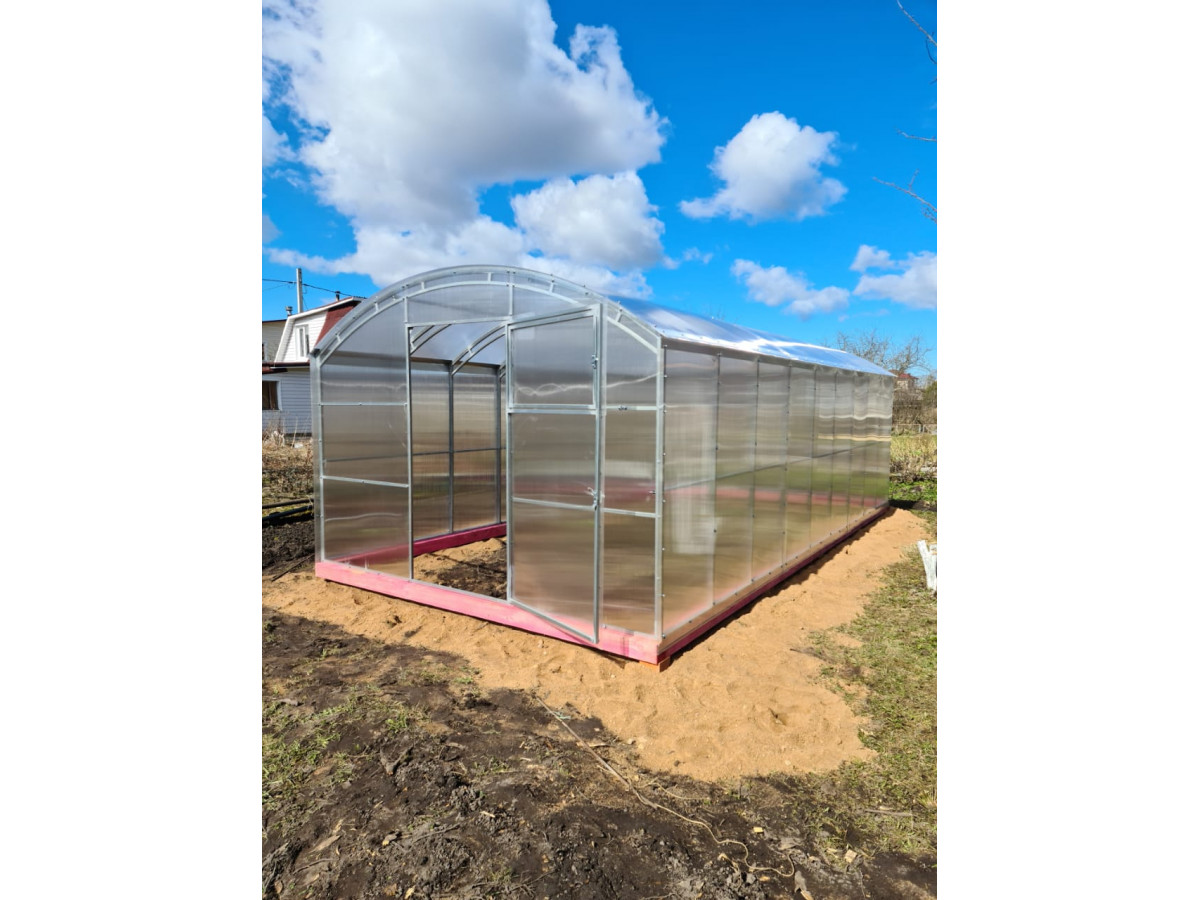 Возможна самостоятельная сборка по подробной инструкции. Сборка теплицы монтажниками-профессионалами компании занимает порядка 3 часов. В качестве основания рекомендуется использовать бетонный, либо деревянный фундамент из бруса. Предварительно брус необходимо обработать антисептиком. Полный комплект состоит из: