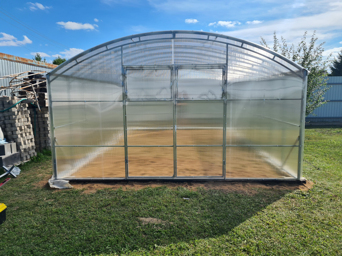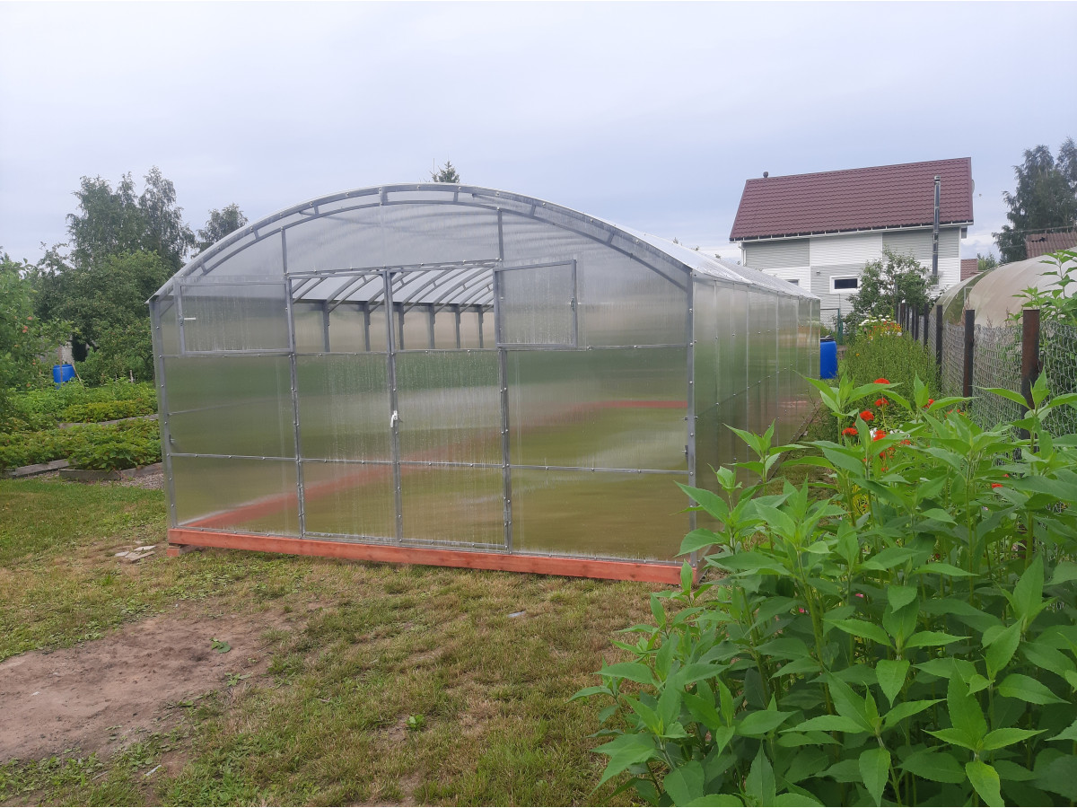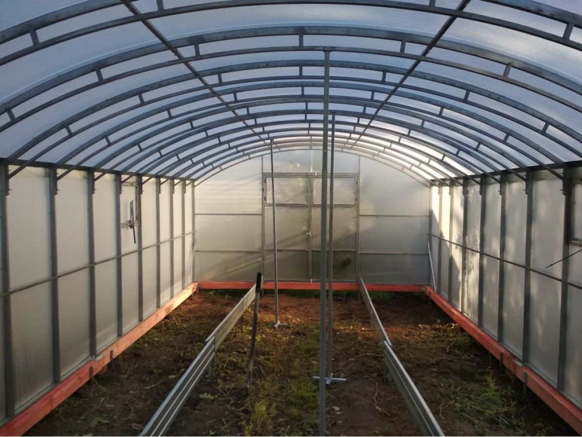 • широкая 4 м, ширина теплицы позволяет организовать 3 широкие полноценные грядки с комфортными проходами между ними;
